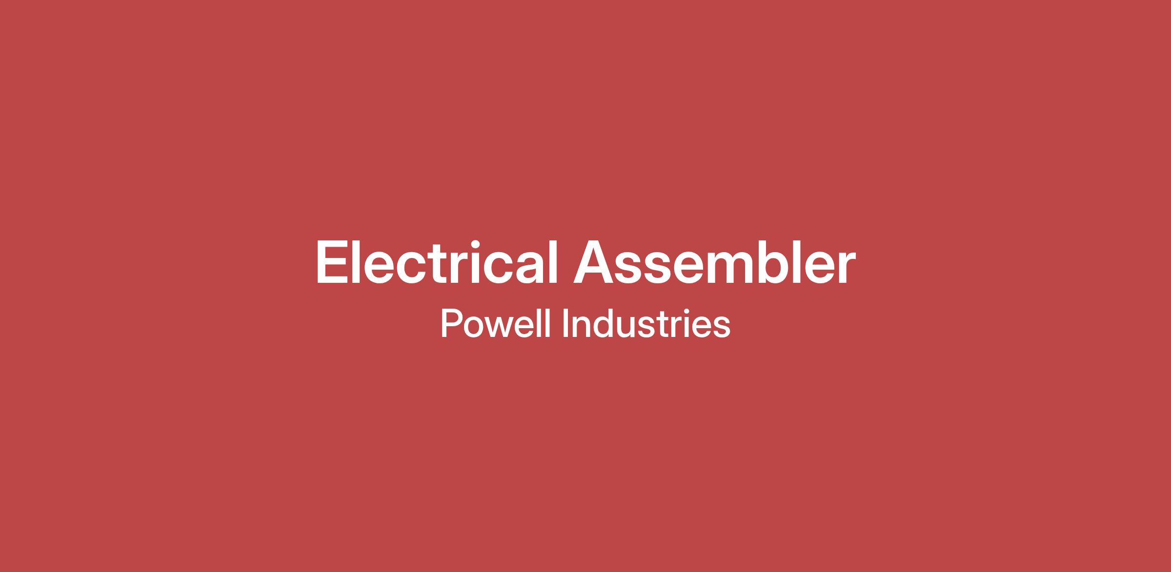 DescriptionPowell is an engineered to order manufacturer of switchgear and electrical equipment for the power generation industry. The Electrical Assembler will perform various duties on power control rooms including bending, running, installing, and terminating electrical conduit. Four 10s Schedule: Monday-Thursday 5:00am-3:30pm