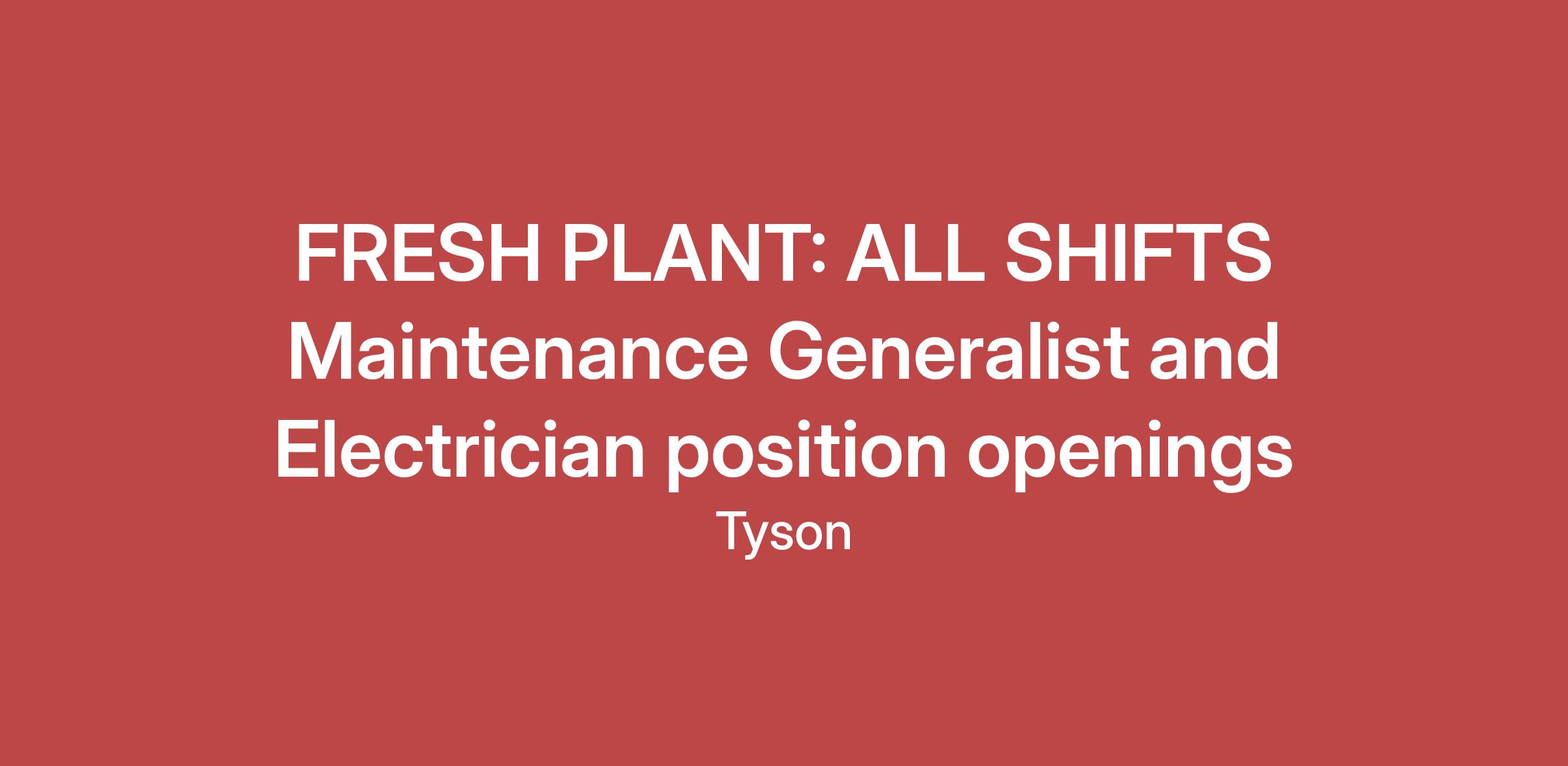 This position is responsible for troubleshooting, maintaining, and repairing all equipment and company assets while maintaining a safe work environment and adhering to Tyson policies and procedures.
