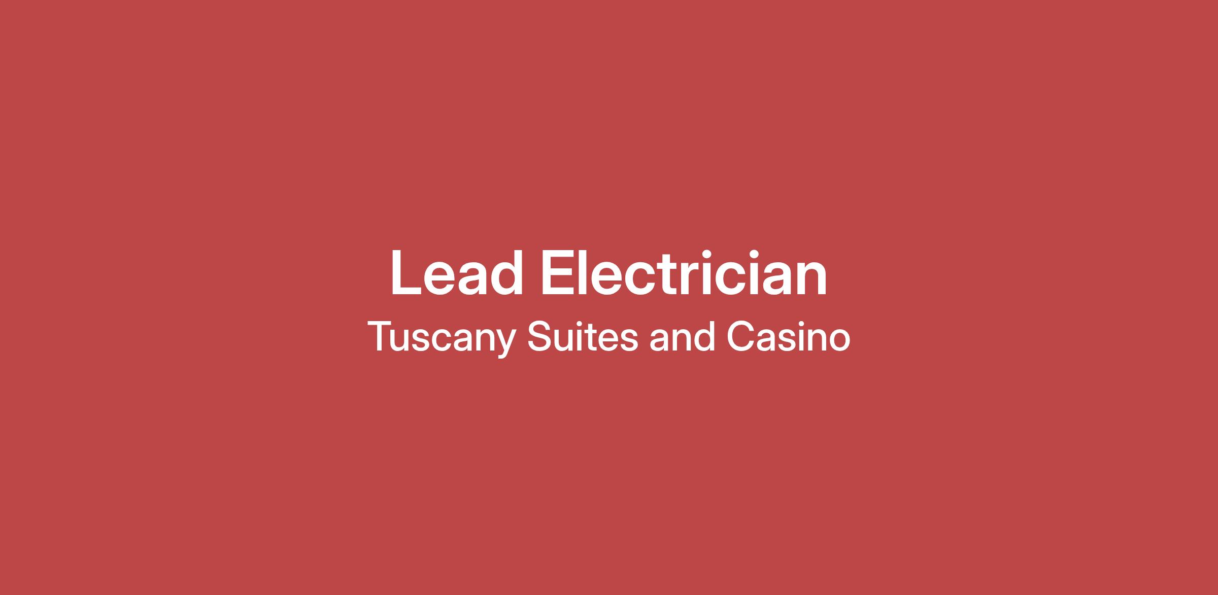 We are seeking a Full Time, hourly Master Electrician to join our team at Tuscany Suites and Casino in Las Vegas, NV. The Lead Electrician oversees and performs skilled electrical work, which involves the installation, maintenance, and repair of electrical systems and equipment. In addition, they provide guidance and direction to other electricians and apprentices.