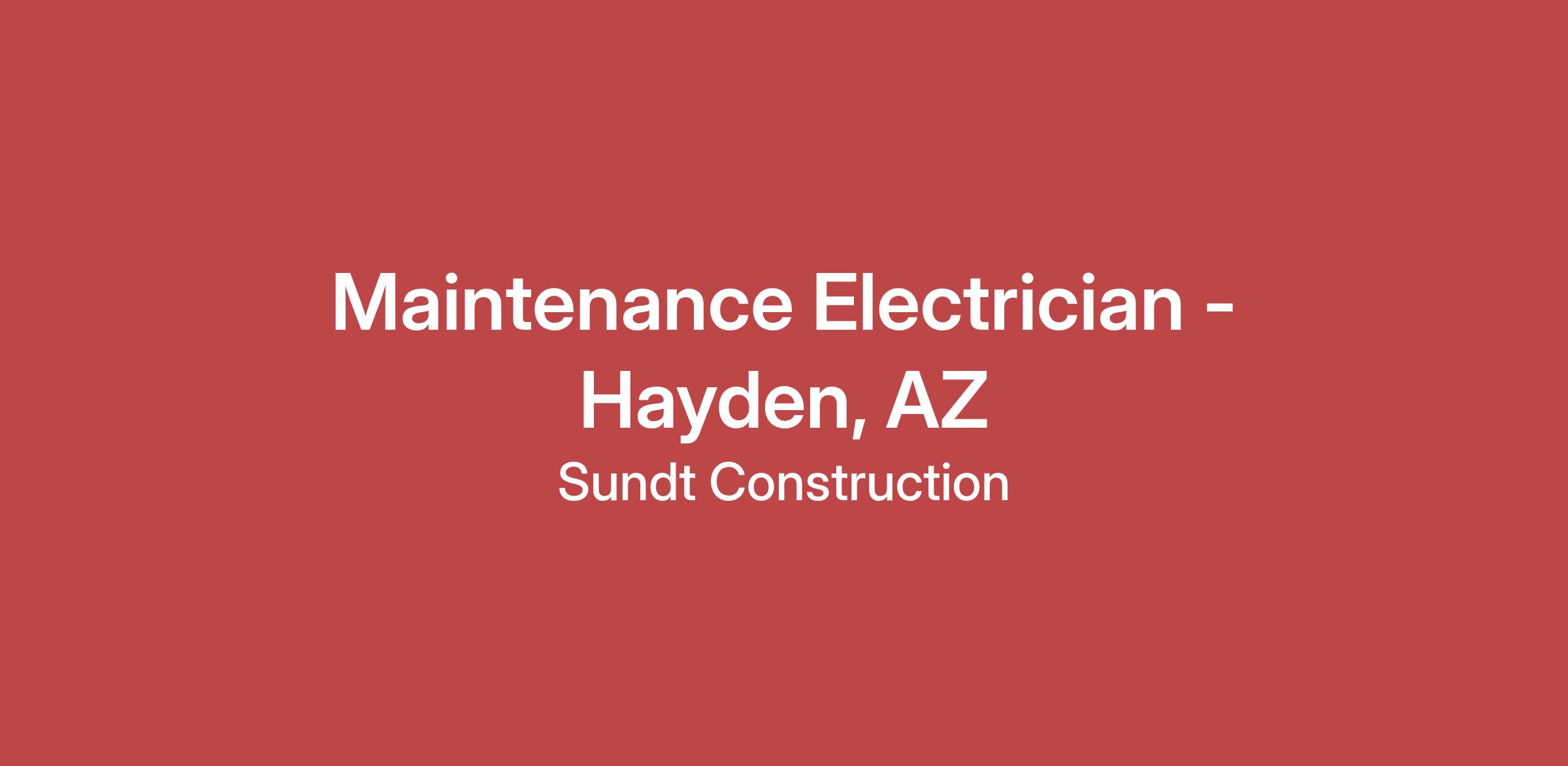 Sundt is seeking a Maintenance Electrician for our project in Hayden, AZ. Pay Rate is $35 per hr working 40+ hrs per week with an additional $140 per day worked per diem. Must be able to pass pre employment drug screen.